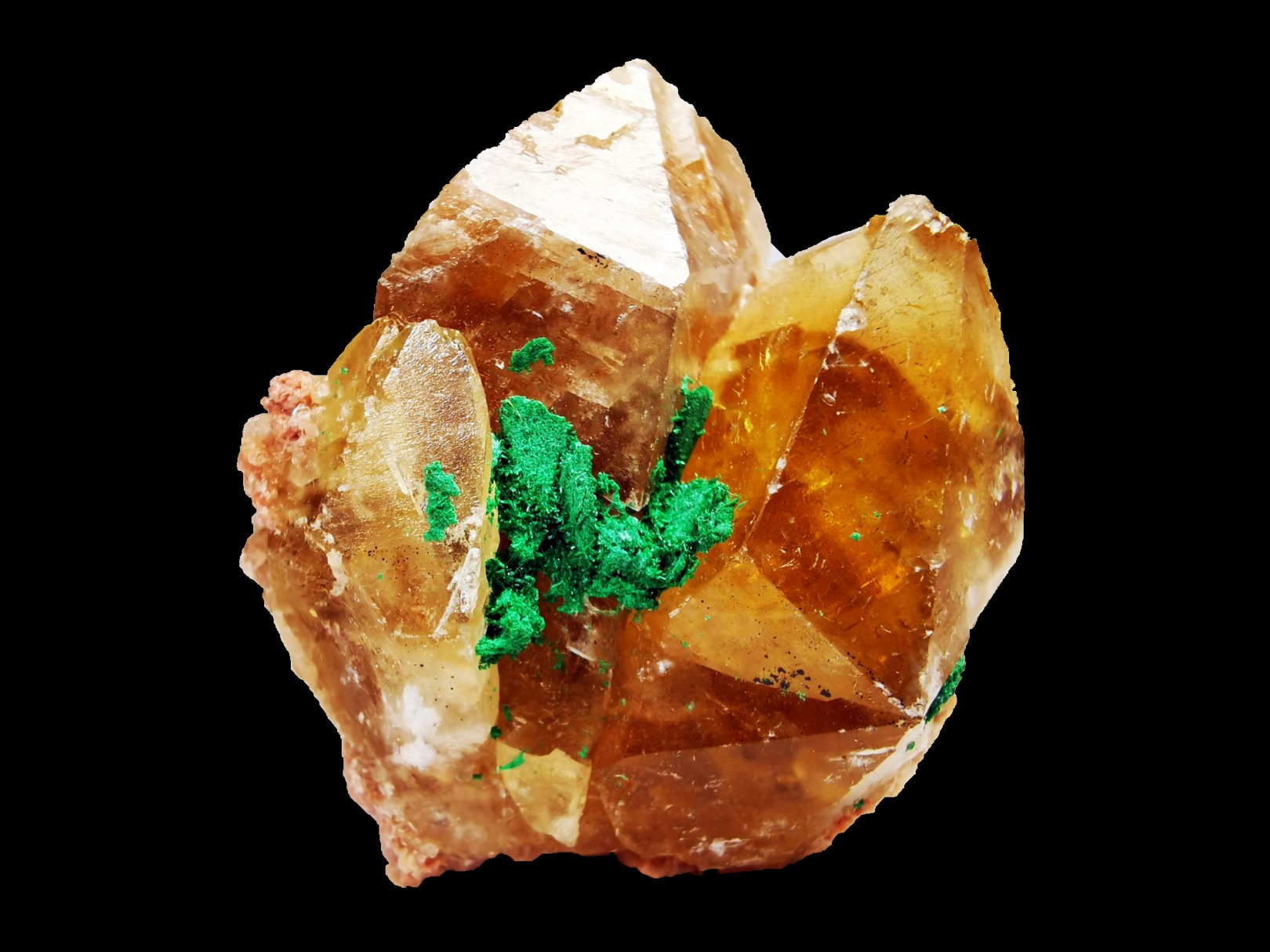 Honey calcite with malachite encrustation