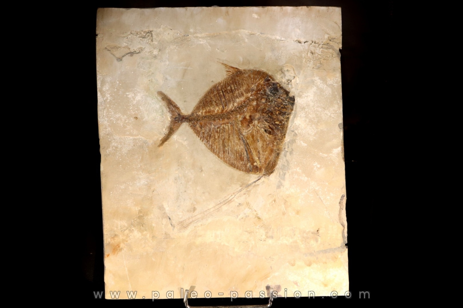 - poisson bien centré sur une plaque fine collée, le dos de la plaque est renforcé en fibre de verre. le fossile est teinté.