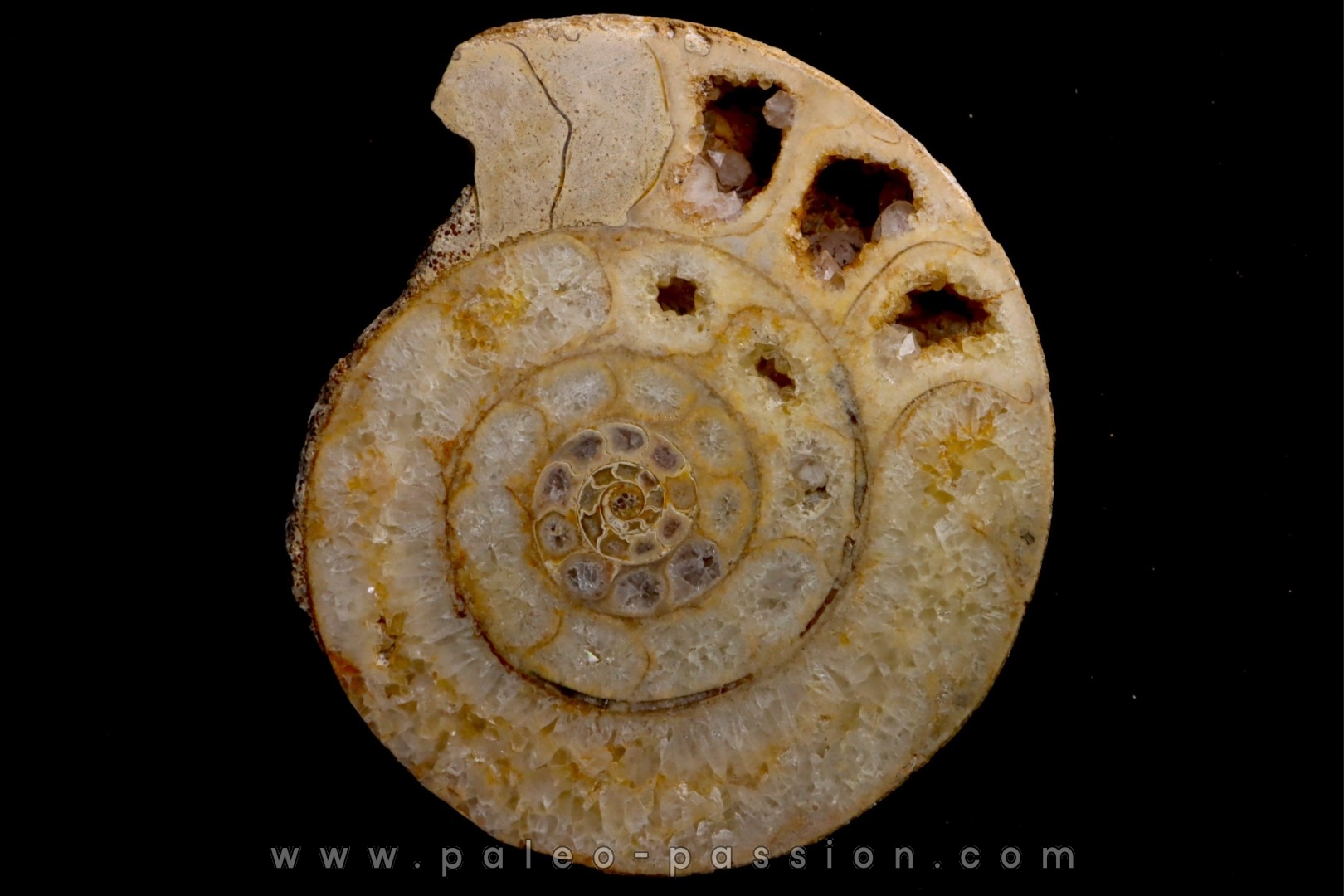 belle ammonite sciée avec loges en quartz