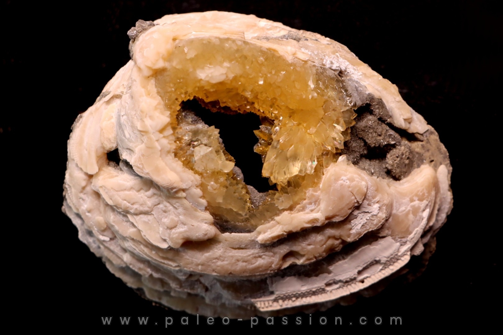 fossile de bivalve avec geode de calcite miel