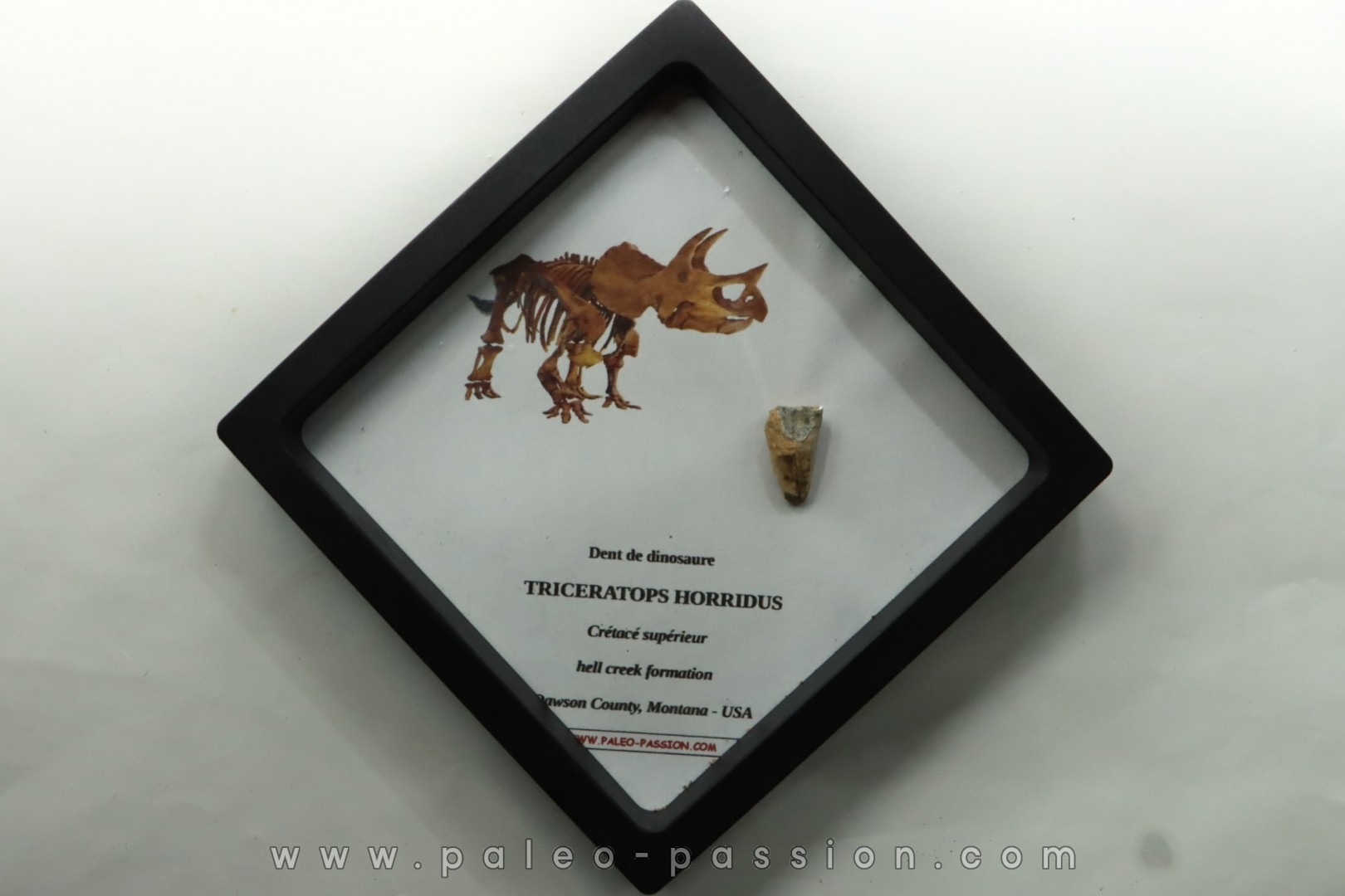 veritable dent (usée) de DINOSAURE TRICERATOPS presenté dans une boite à membrane.