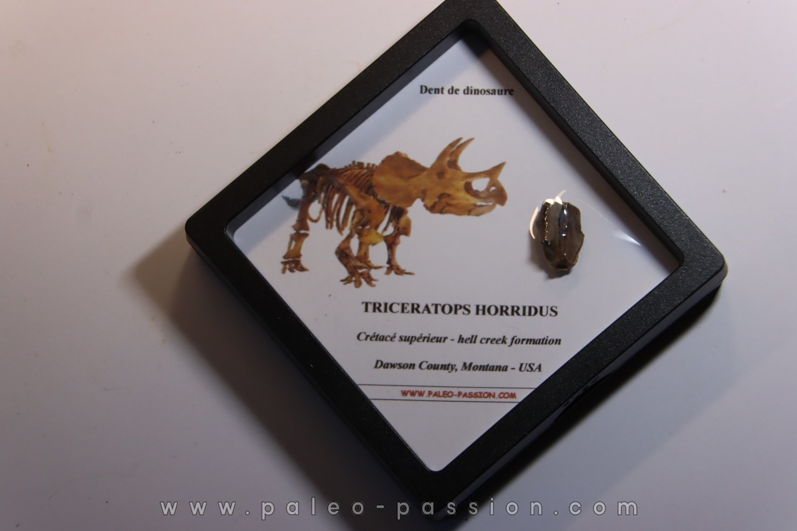 véritable dent (usée) de DINOSAURE TRICERATOPS présenté dans une boite à membrane.