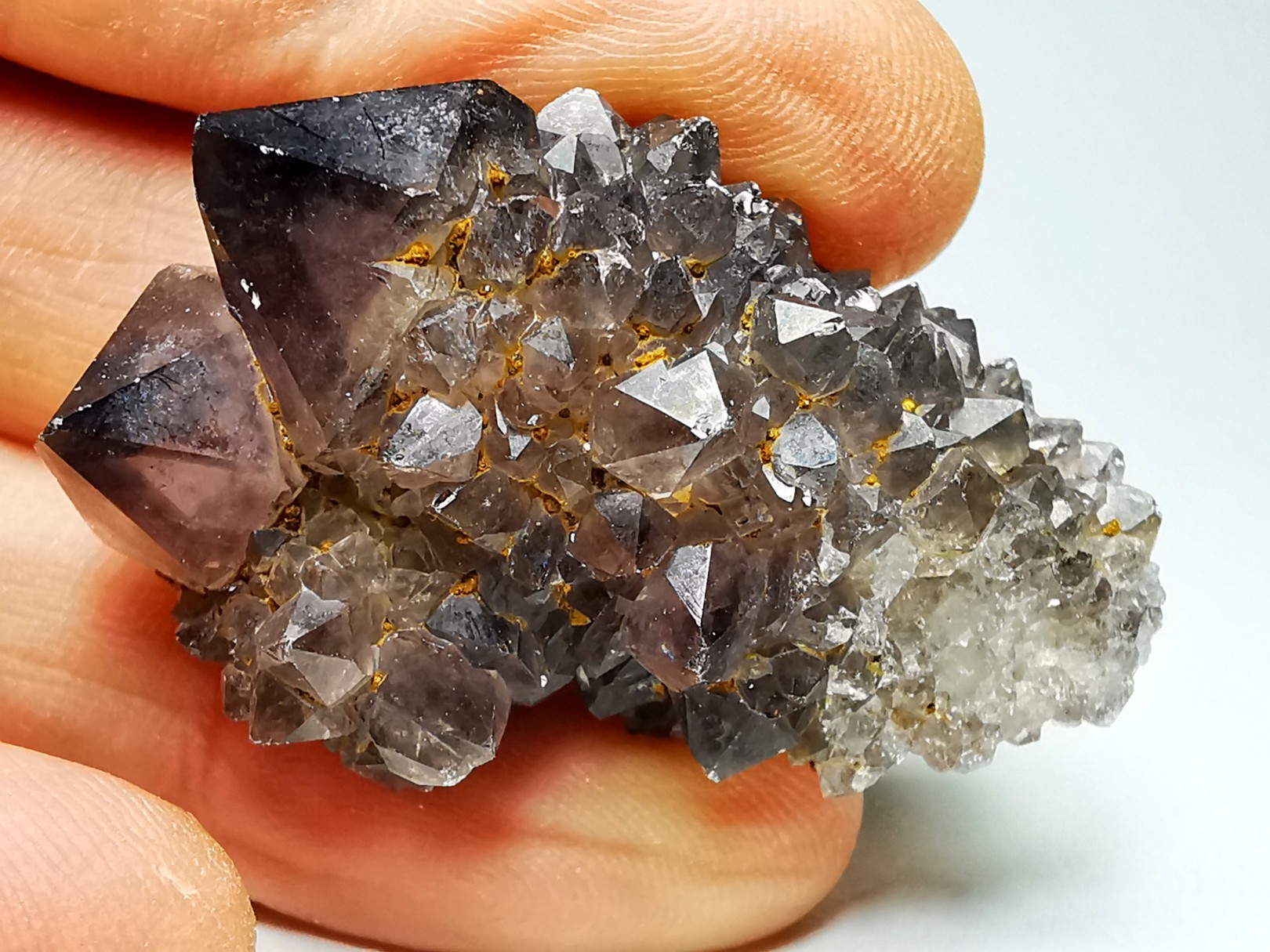 Cristaux de quartz incrustés d'une seconde génération de cristaux plus petits, formés sur les faces du prisme.