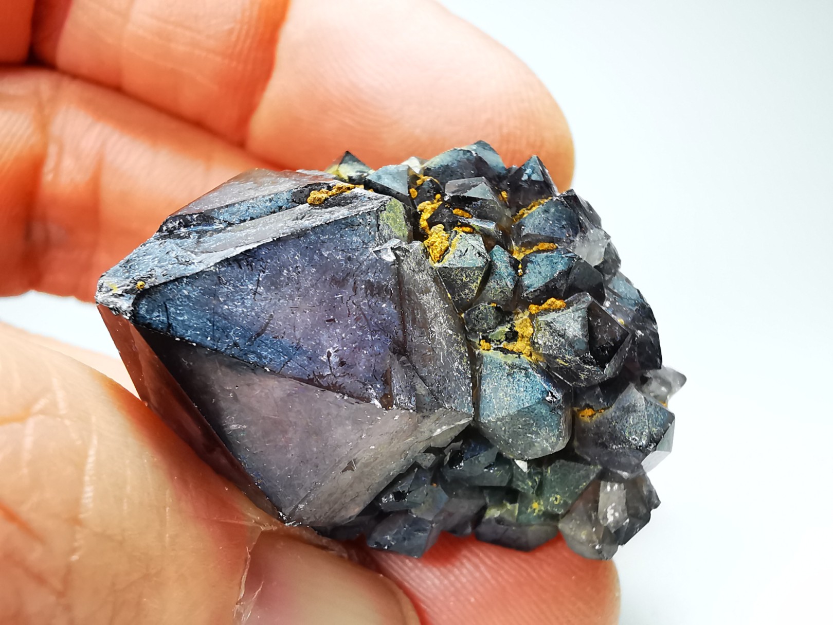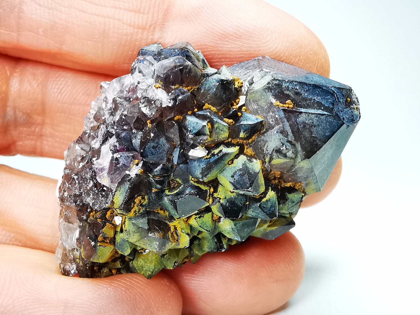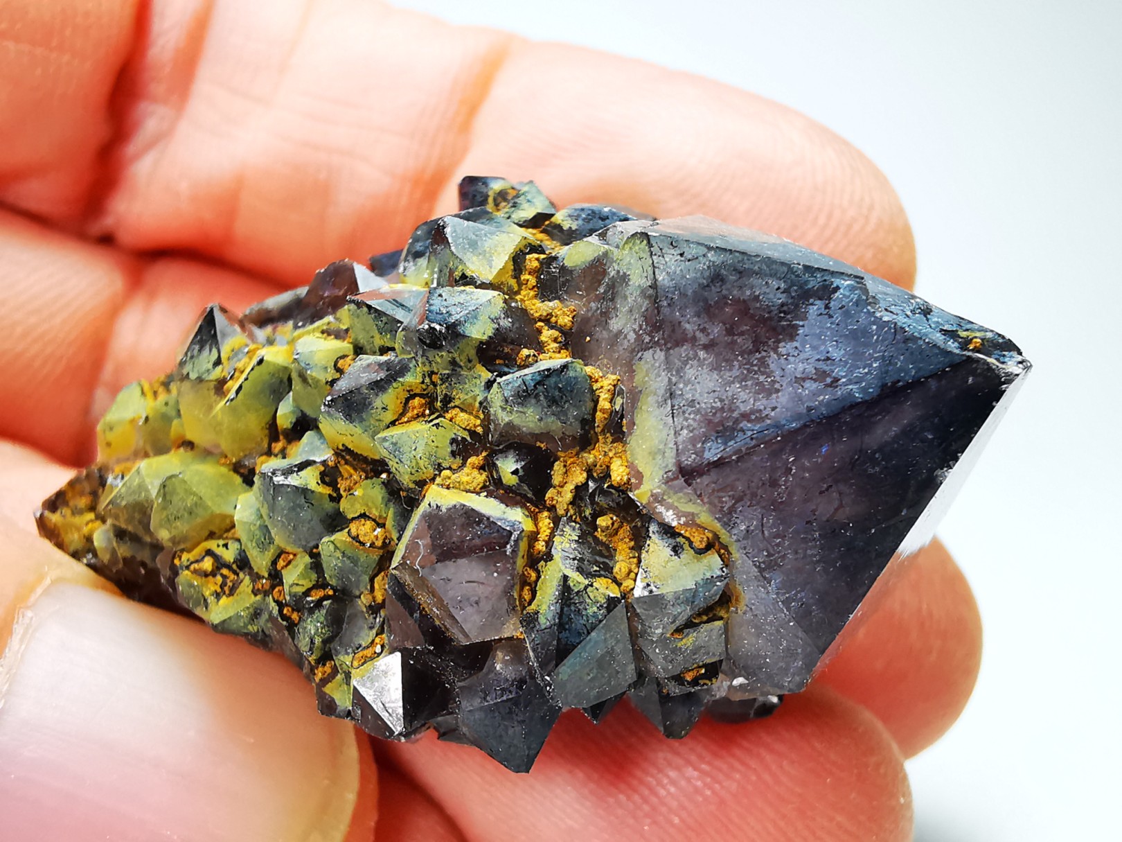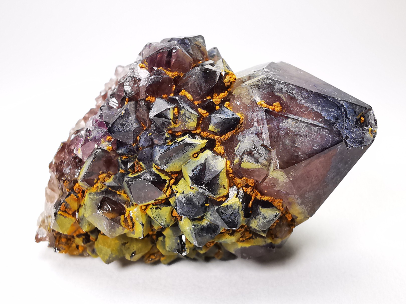 Cristaux de quartz incrustés d'une seconde génération de cristaux plus petits, formés sur les faces du prisme.